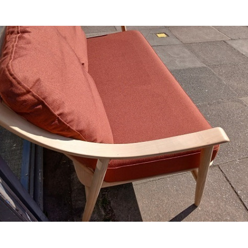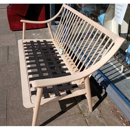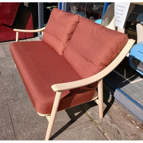 The sofa features Ercol’s signature steam-bent solid ash wood frame, with elegant curved arms and distinctive spindle detailing, giving it a light, mid-century inspired look.